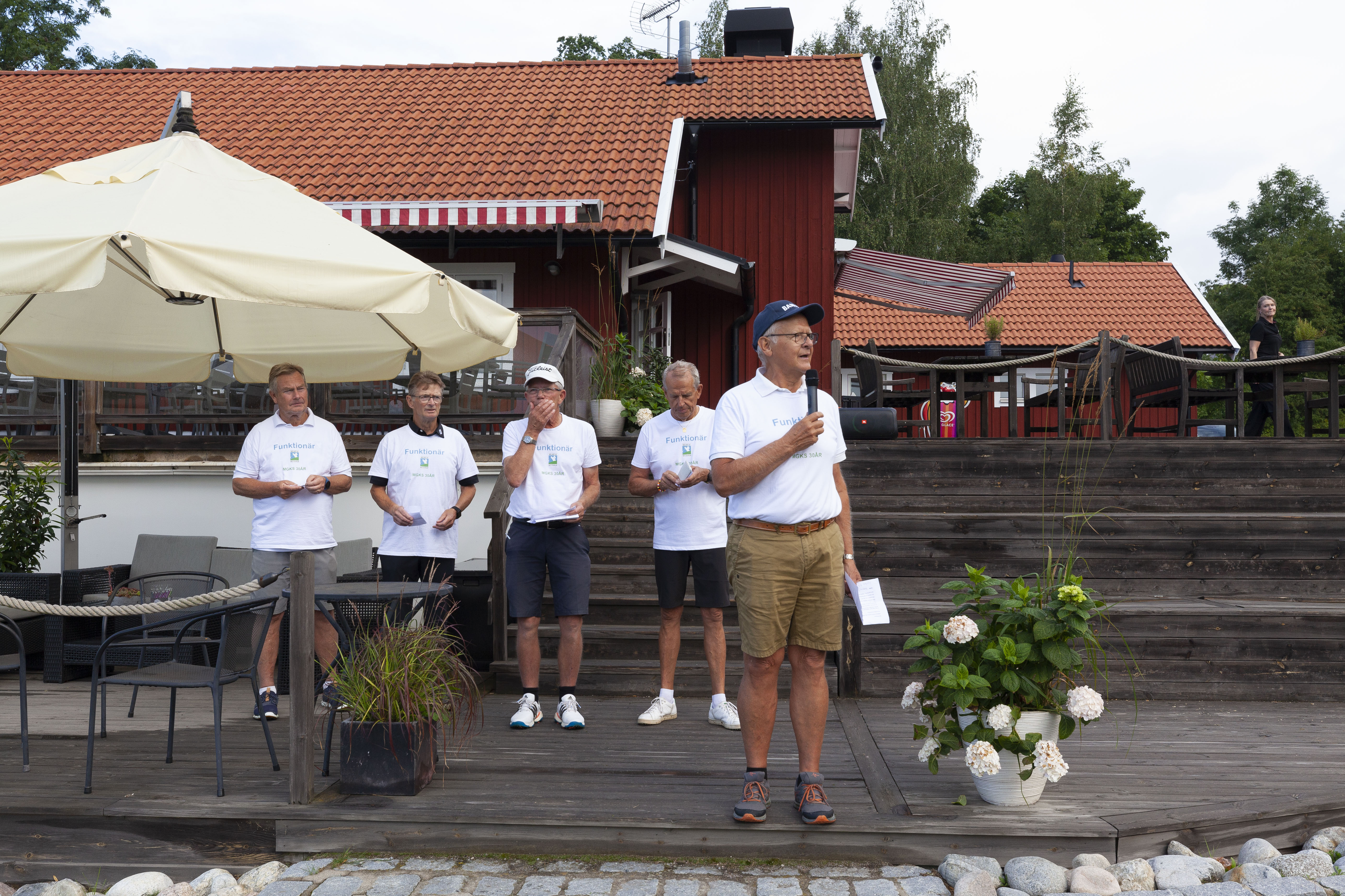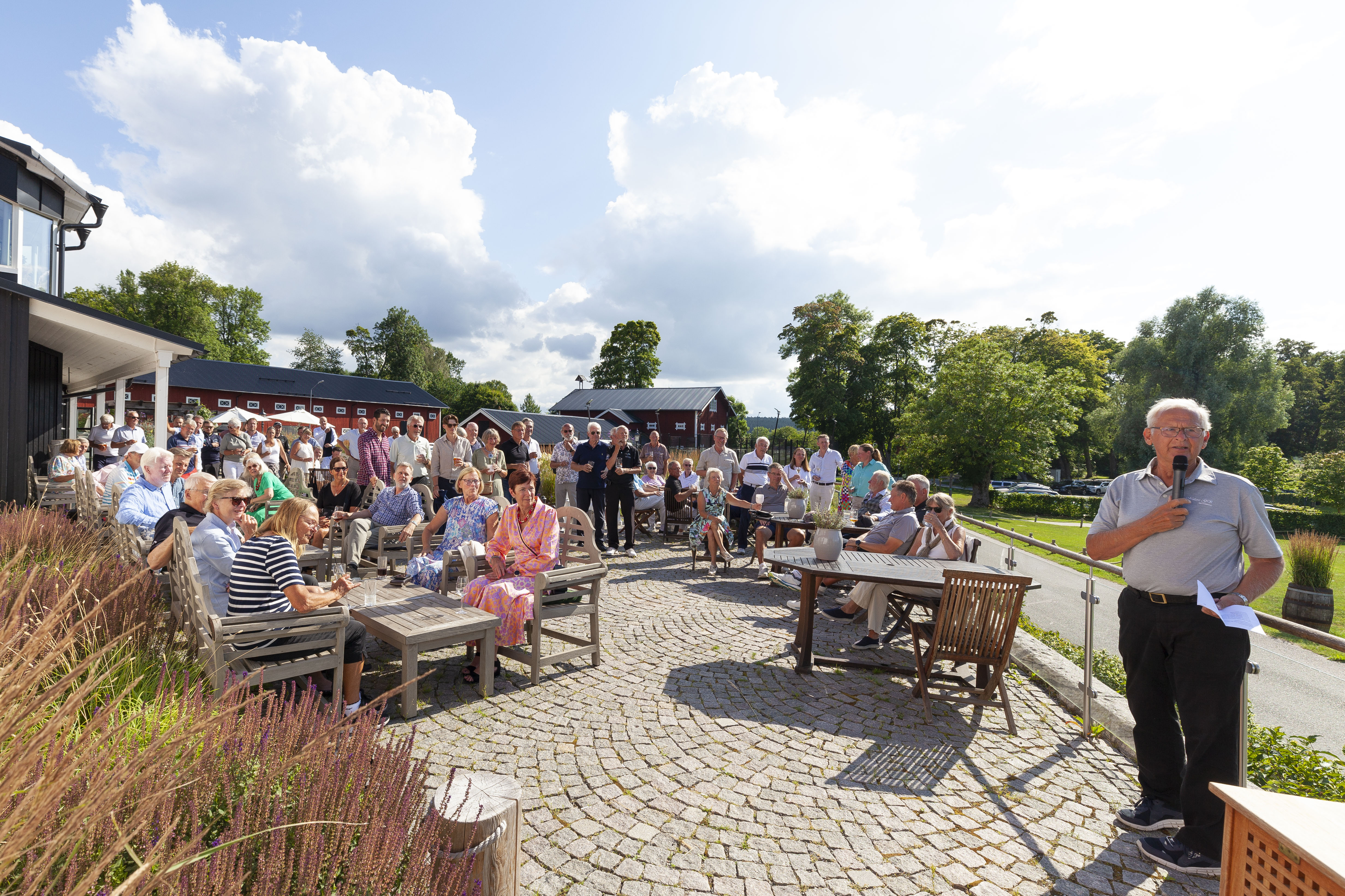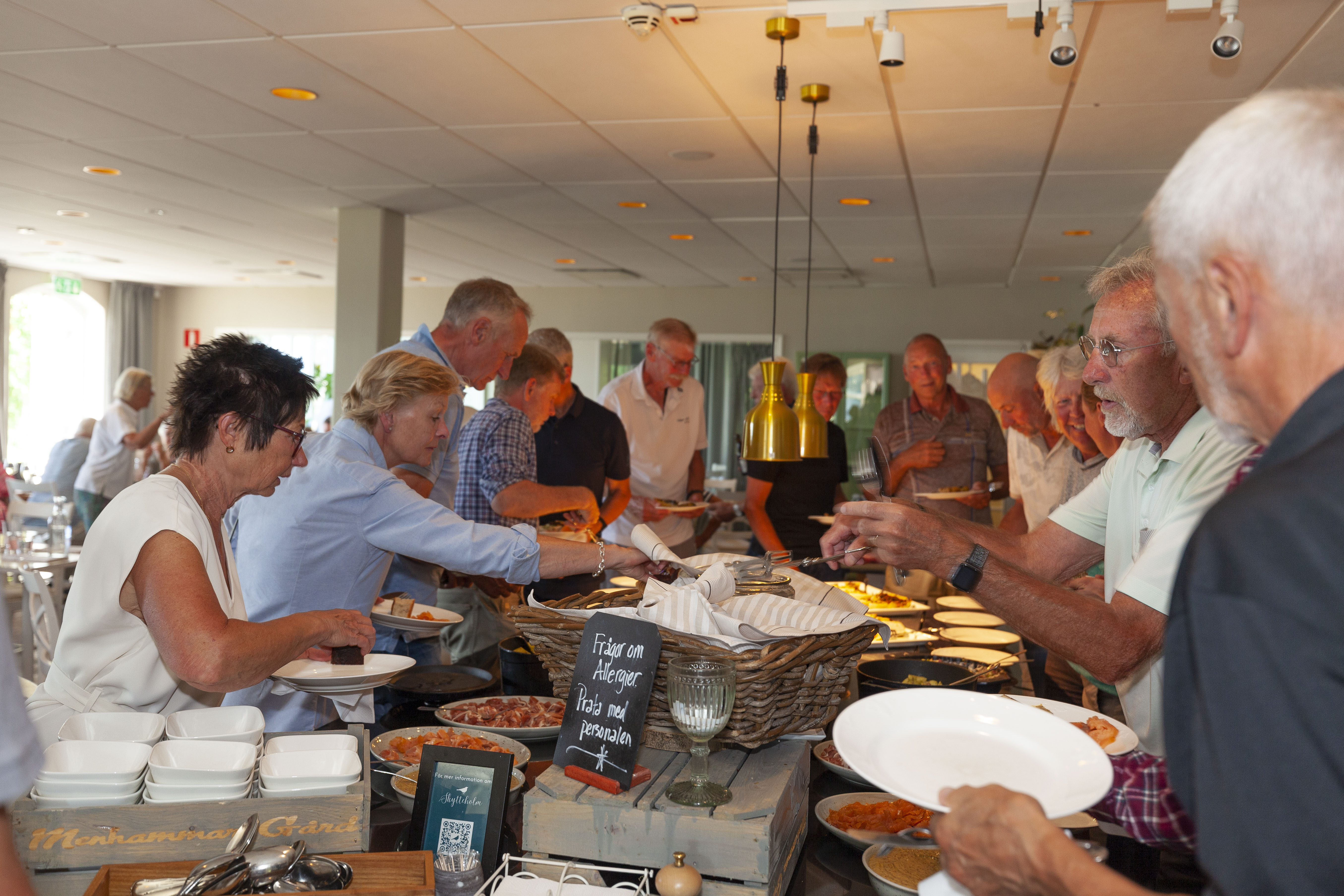 JUBILEUMSBUFFÉN var jubileumsdagens andra del. Det härliga vädret var naturligtvis kvar och vid samlingen utanför Skyttegården passade jubileumskommitténs ordförande Kjell Sjöbeck på att hälsa alla välkomna och speciellt nämna de gäster som varit en viktig del i vår klubbs tillkomst och utveckling. Den goda middagen avnjöts inomhus innan det var dags för dagens prisutdelning.