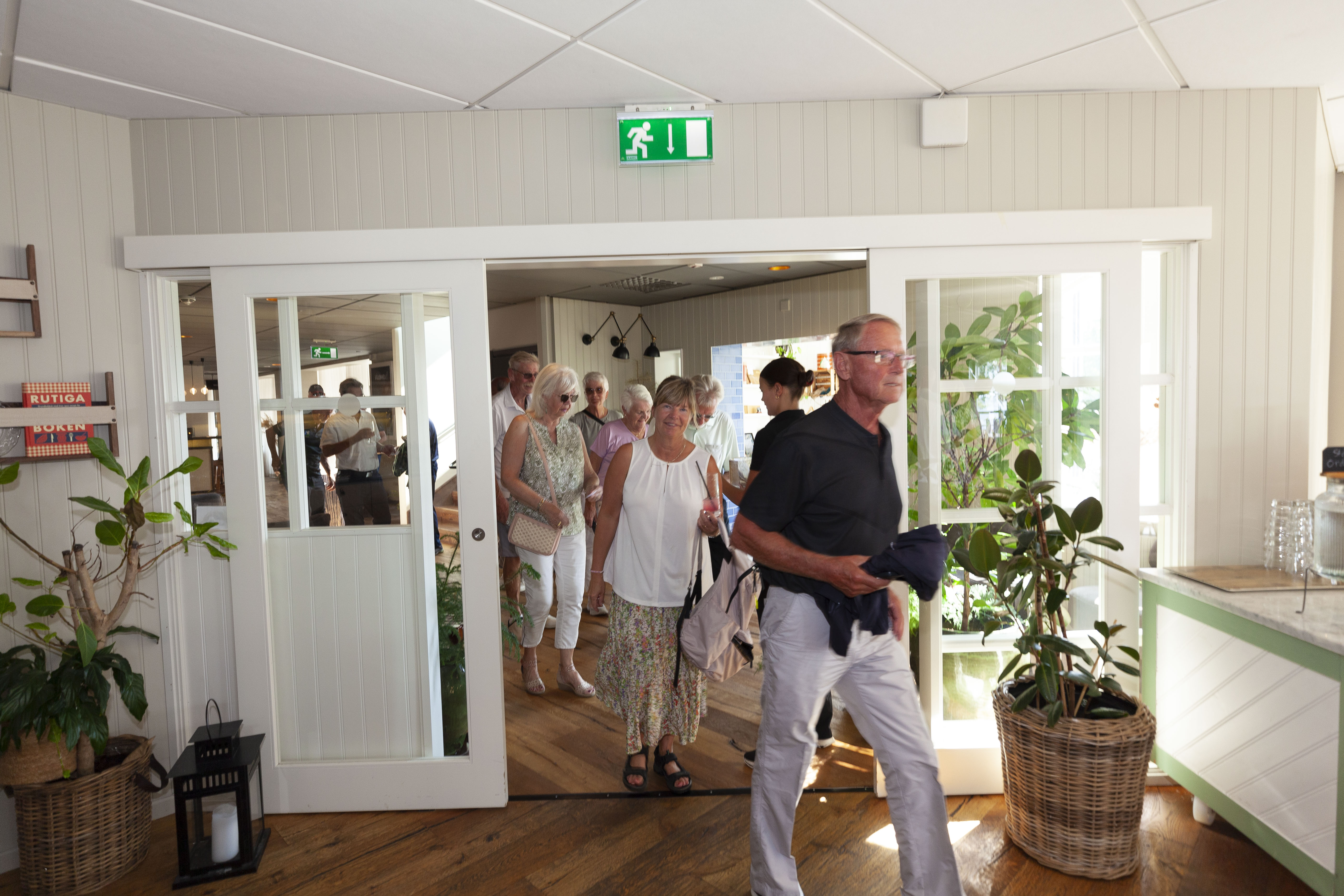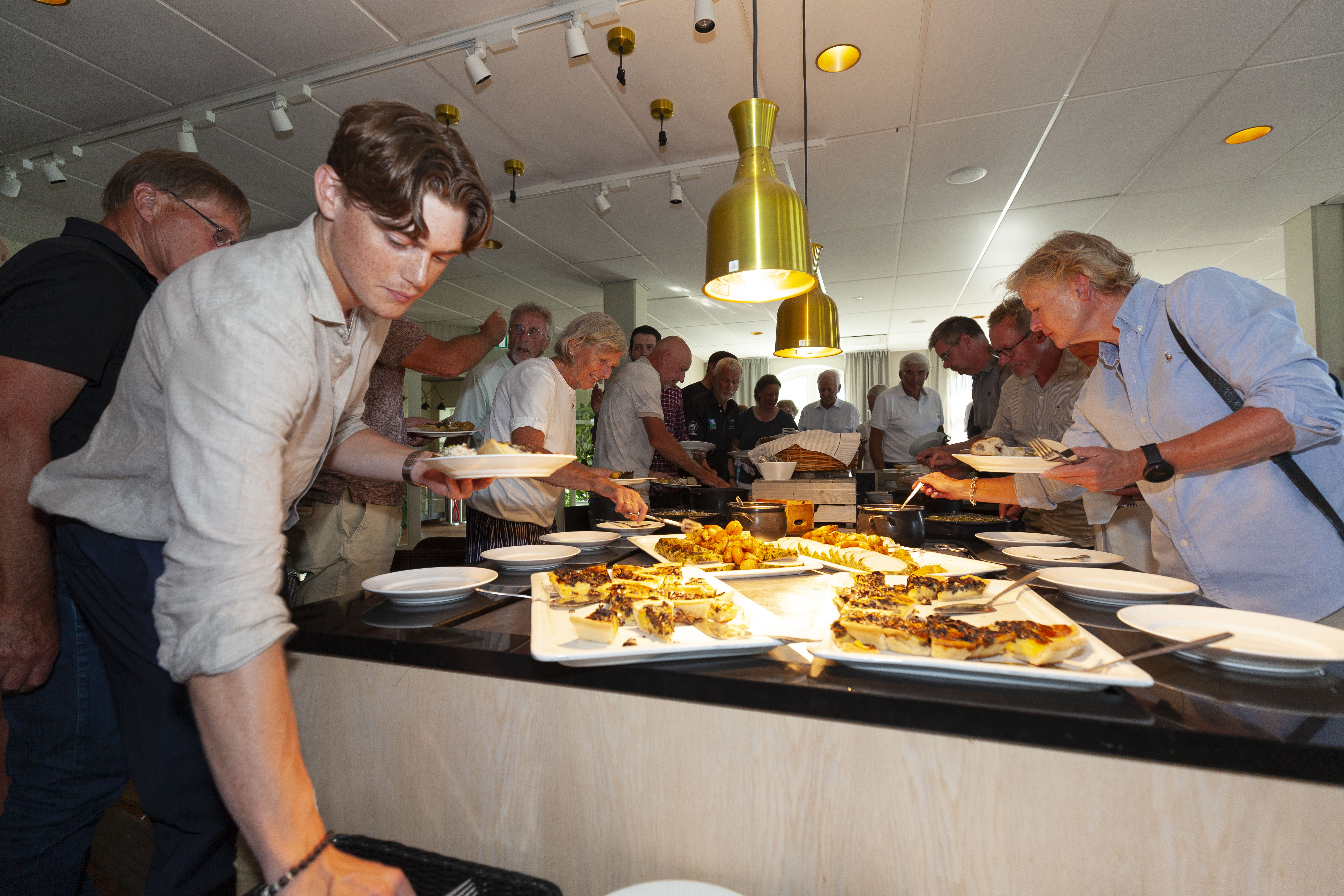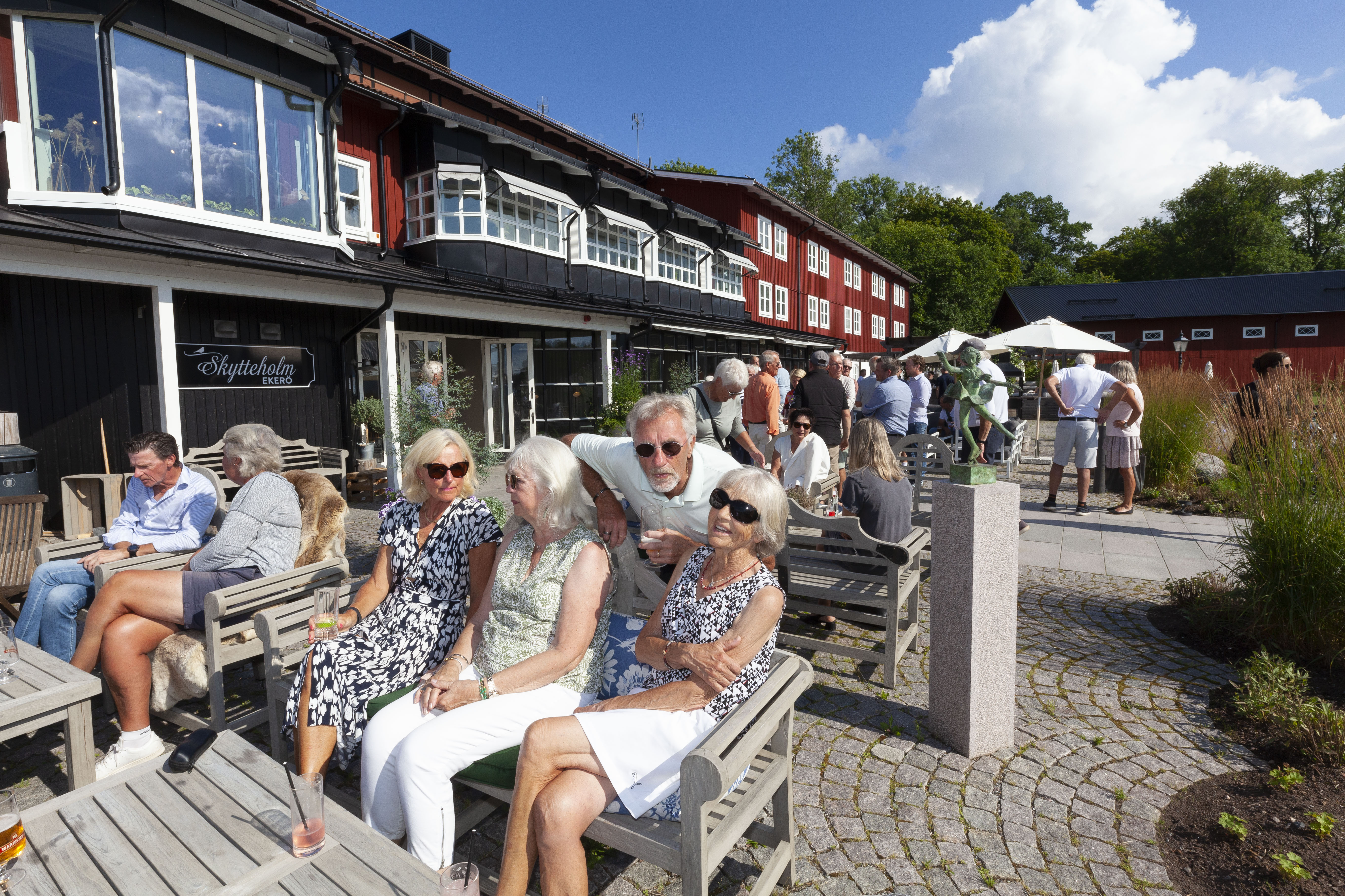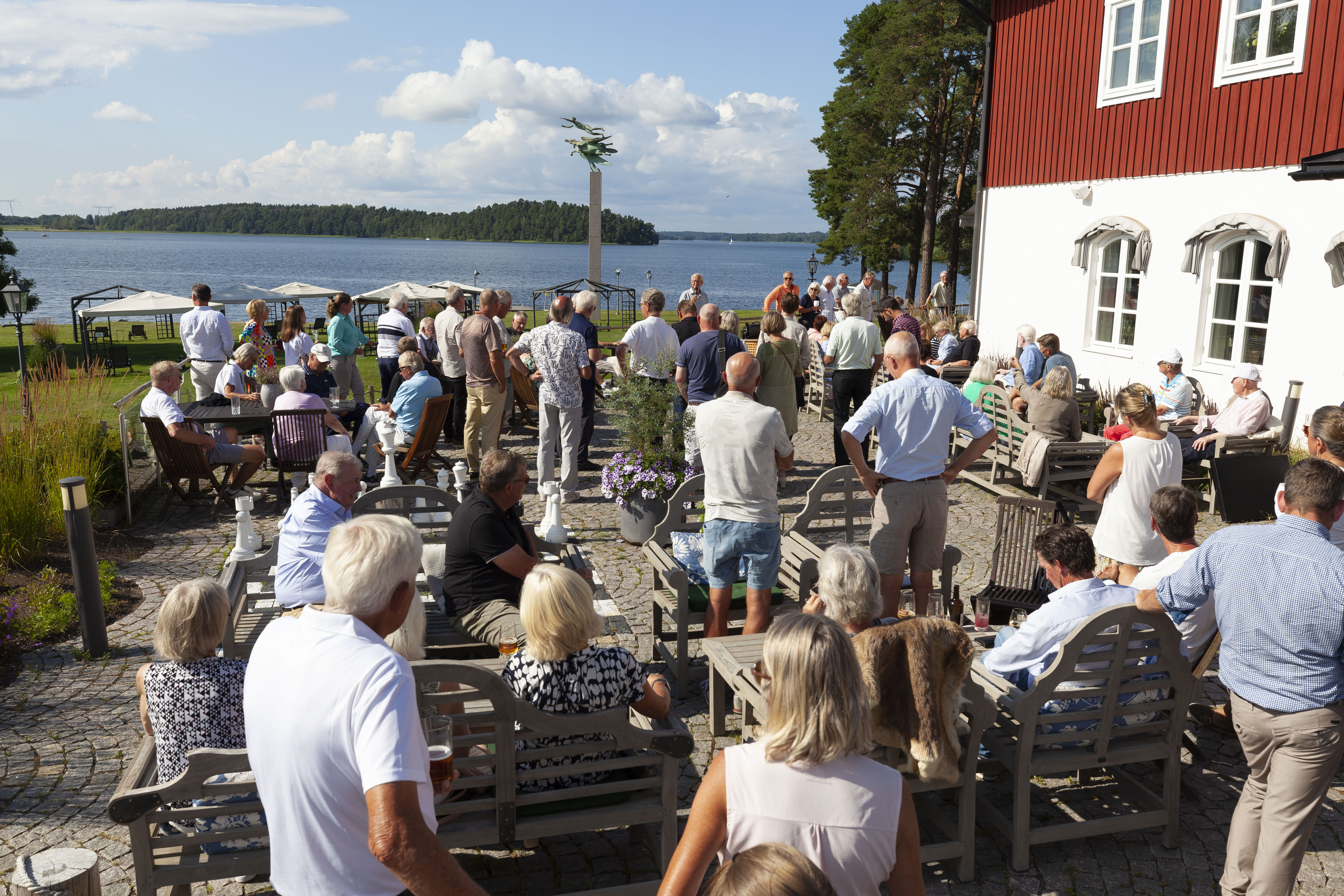 JUBILEUMSBUFFÉN var jubileumsdagens andra del. Det härliga vädret var naturligtvis kvar och vid samlingen utanför Skyttegården passade jubileumskommitténs ordförande Kjell Sjöbeck på att hälsa alla välkomna och speciellt nämna de gäster som varit en viktig del i vår klubbs tillkomst och utveckling. Den goda middagen avnjöts inomhus innan det var dags för dagens prisutdelning.