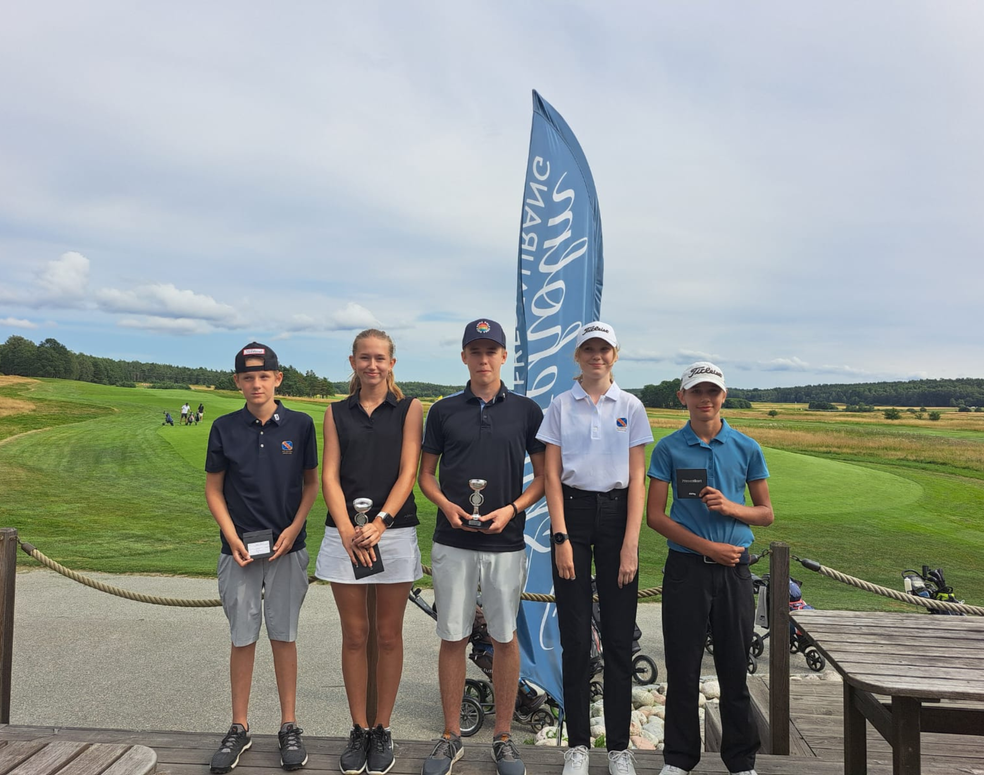 Till sist hade vi sex lyckliga pristagare. På bilden syns Linus Eklund (Viksjö GK), Theo Sporron (Mälarö GK Skytteholm), Victor Emmervall (Sollentuna GK). Kajsa Carlsson (Ågesta GK), Embla Edlund (Wermdö GCC), Linnea Lindvåg (Sollentuna GK) (inte med på bild). I pojkklassen fanns många spelare från Mälarö och Troxhammar på framskjutna placeringar.